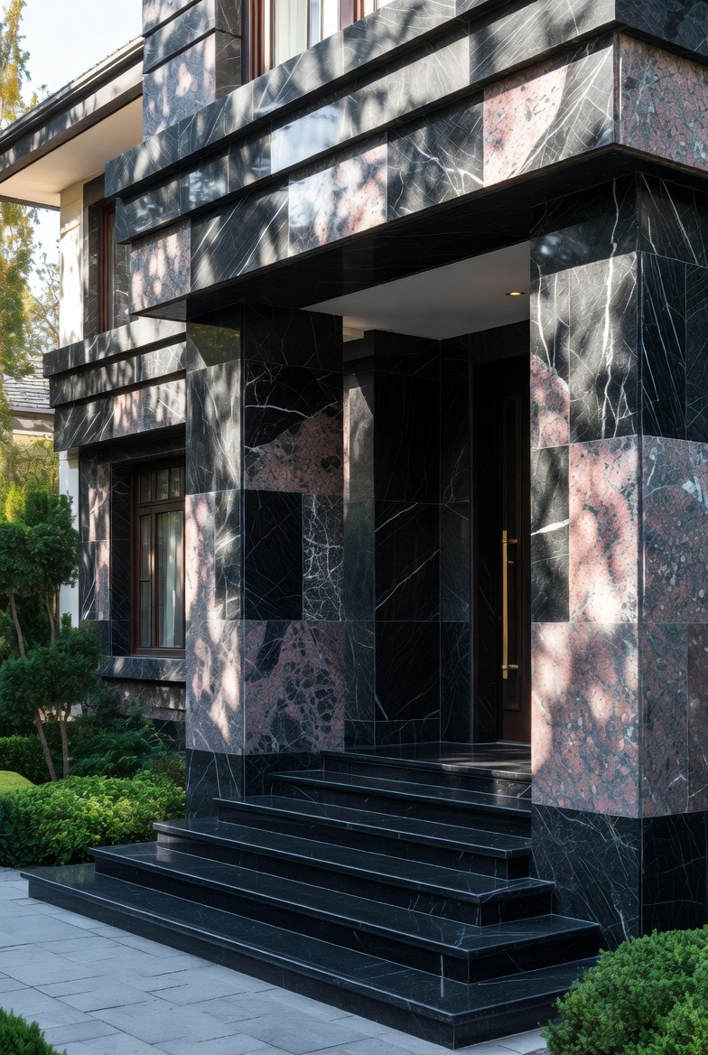 Особливо популярними є гранітні плити з термообробленою поверхнею, які використовують для сходів і вхідних груп. Під час термічної обробки поверхня каменю стає шорсткою та протиковзною, що значно підвищує безпеку експлуатації під час дощу або снігу. Для вертикальних поверхонь — фасадів, колон і декоративних елементів — частіше застосовують шліфовані або поліровані плити, які максимально підкреслюють природну текстуру граніту.