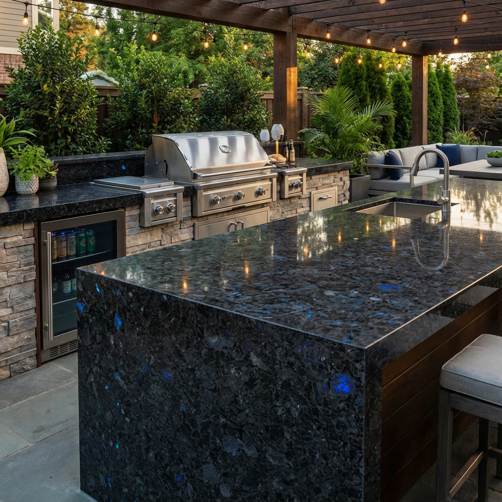 Матеріал, з якого виготовляється стіл з лабрадориту волга блю для барбекю, піддається повному спектру професійної каменеобробки: різання, шліфування, полірування, термообробка, фаскування, точне калібрування та комбіновані технології обробки поверхонь. Це дозволяє створювати не лише функціональний елемент, а й справжній декоративний акцент, що підкреслює статусність простору. Граніт чи габро демонструють природну глибину кольору, унікальну текстуру та високу стійкість до механічних, температурних і атмосферних впливів, що гарантує тривалий термін служби без втрати зовнішнього вигляду.