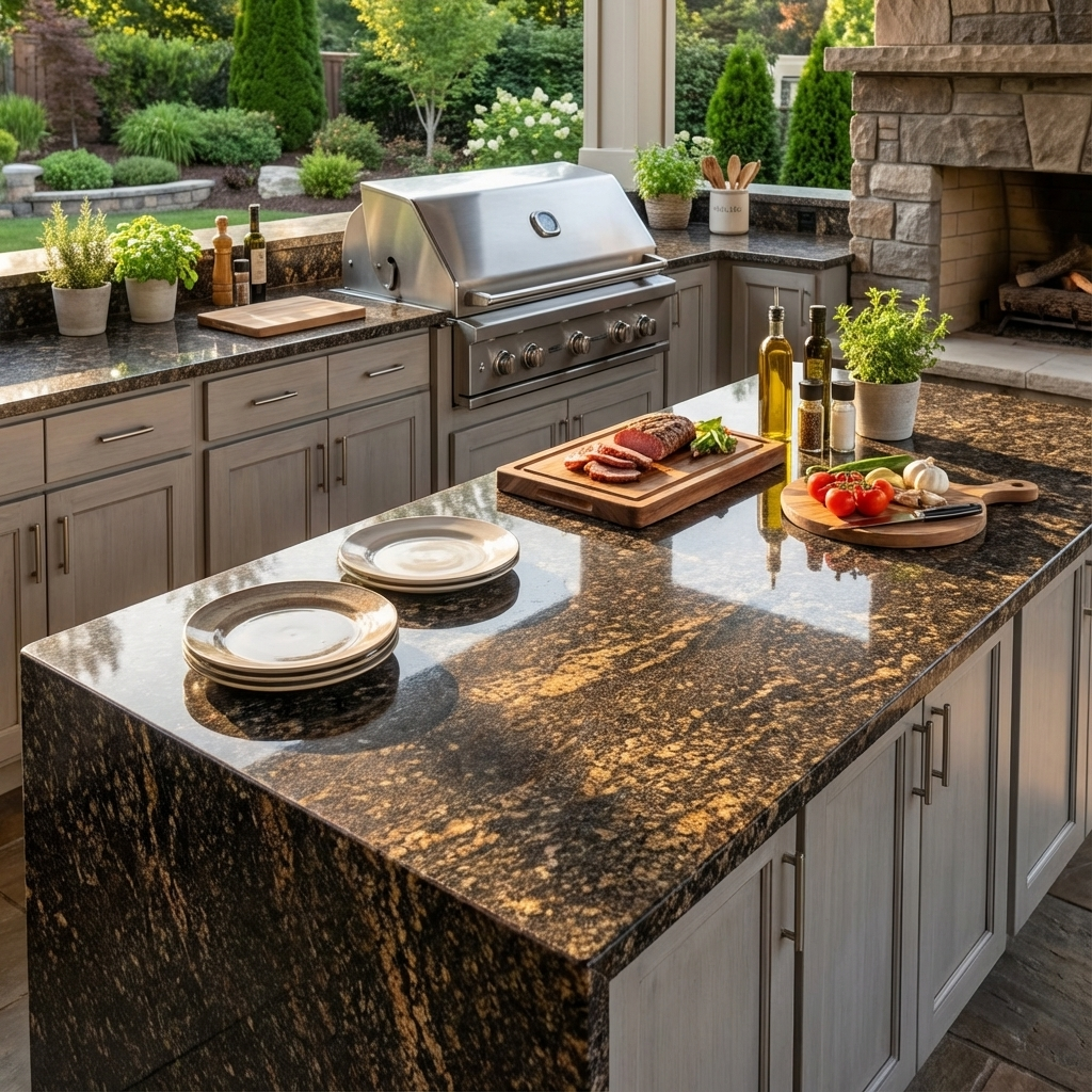 Матеріал, з якого виготовляється стільниця з граніту корнинське для барбекю, піддається повному спектру професійної каменеобробки: різання, шліфування, полірування, термообробка, фаскування, точне калібрування та комбіновані технології обробки поверхонь. Це дозволяє створювати не лише функціональний елемент, а й справжній декоративний акцент, що підкреслює статусність простору. Граніт чи габро демонструють природну глибину кольору, унікальну текстуру та високу стійкість до механічних, температурних і атмосферних впливів, що гарантує тривалий термін служби без втрати зовнішнього вигляду.